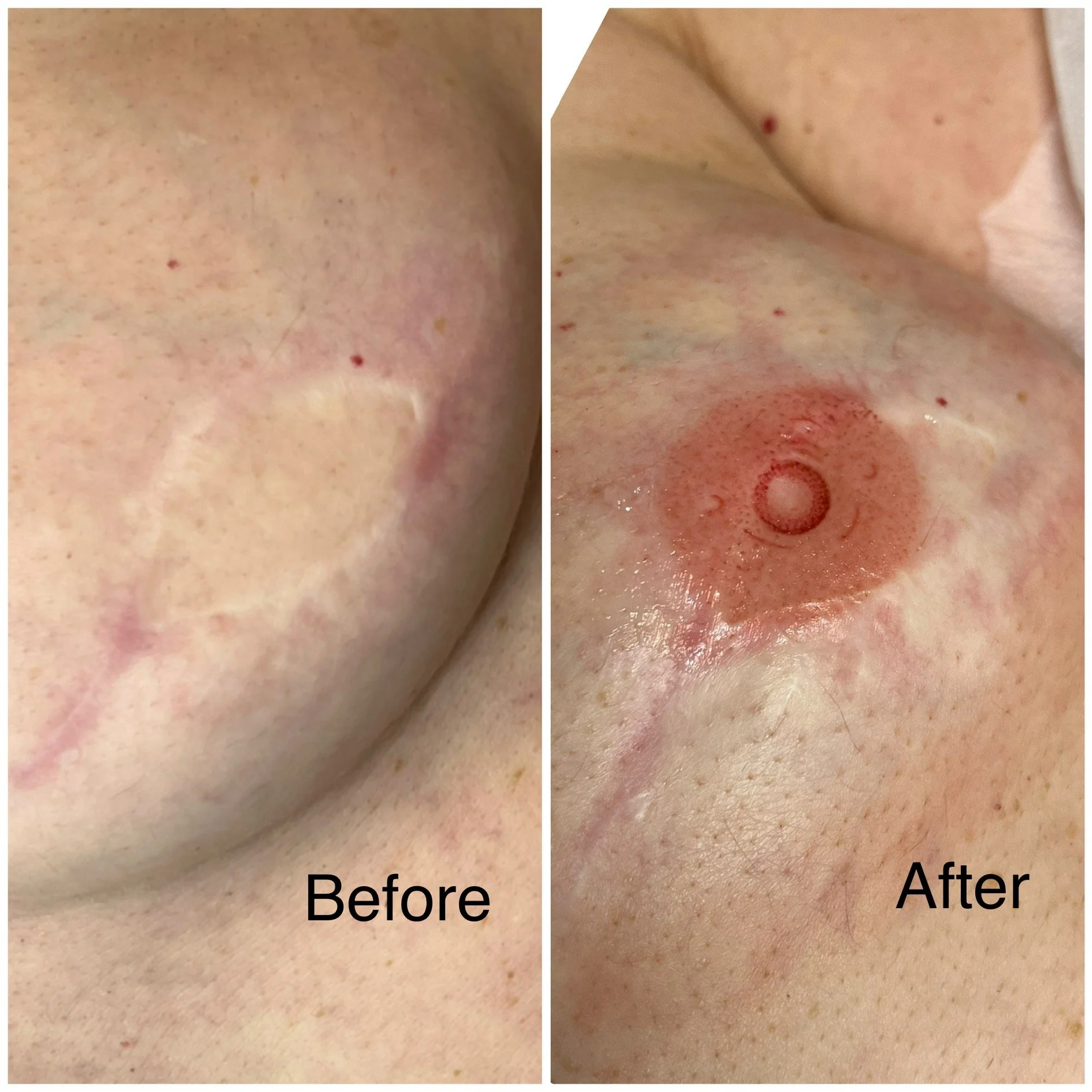 She did her research and decided to learn the award-winning Vicky Martin Method of 3D Areola Tattooing for creating a realistic looking nipple and areola on a reconstructed breast. It’s a two-appointment process: the initial tattooing, and then a follow-up appointment six weeks later to add more details or color.