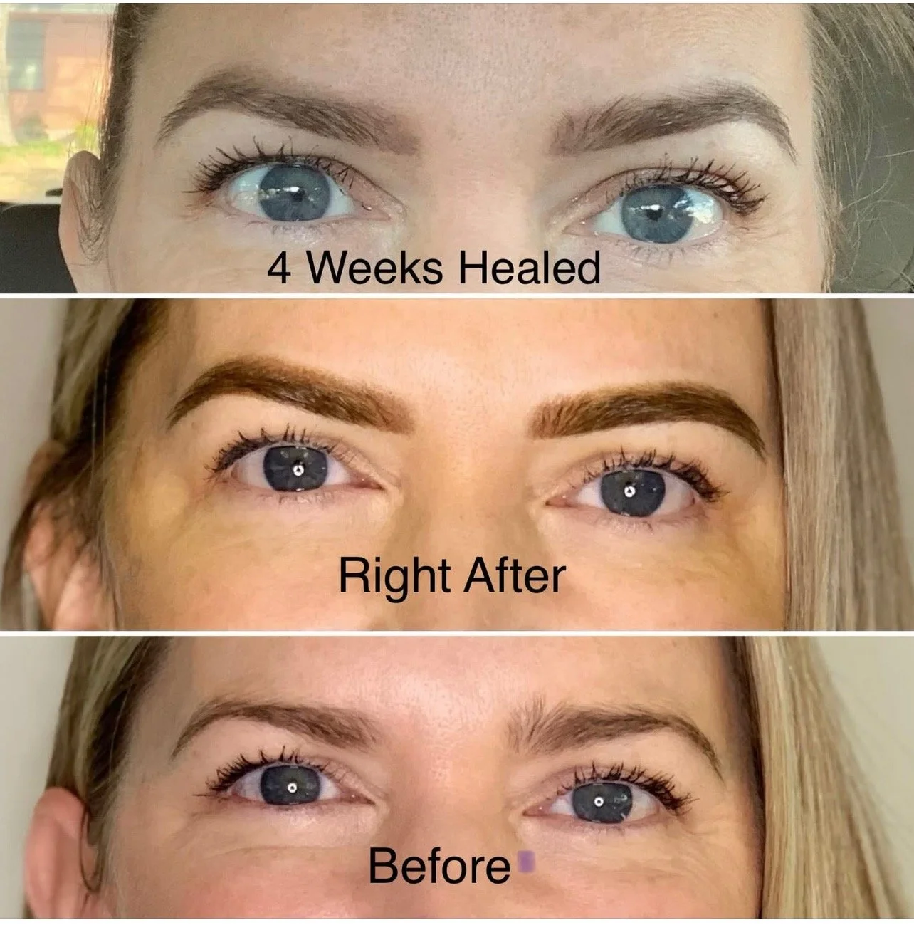 Before, after, and healed photos of Erica Miles Beauty powder brow cosmetic tattoo service.